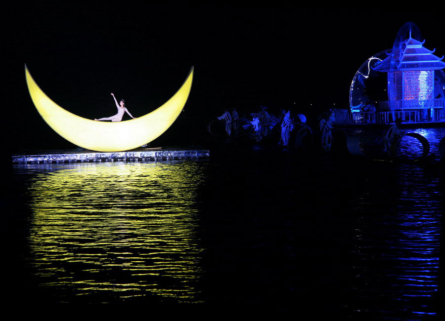 新浪娱乐讯 2004年,张艺谋历时四年时间精研的《印象·刘三姐》终于创作完成,在这部大型实景剧中,张艺谋首次采用自然景观的形式,以方圆两公里的阳朔书童山段漓江水域,十二座背景山峰,以及无垠的天穹为舞台,构成了一个世界上最大的山水剧场。在这个天然脉动的剧场里,观众能真正感受到大自然与人类艺术的完美结合。那些随时而来捉摸不定的风雨云雾,都成为整个演出的一部分,演员中很大部分都是来自当地土生土长的普通农民,而那些遍布在山峦湖泊之间的千万个璀璨灯光音响设施,又让怀疑眼前的这一切是否真实……可以说,这是张艺谋对舞台剧的一次革命。