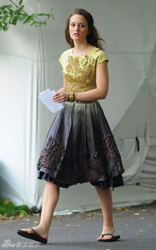 新浪娱乐讯 北京时间8月19日(美国当地时间8月18日),热门美剧《绯闻女孩》(Gossip Girl)在纽约拍摄外景,女主角莉顿-梅斯特(Leighton Meester)亮相片场,长裙配夹脚拖鞋。