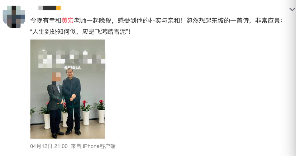 新浪娱乐讯 12日晚,有网友在微博晒出与60岁黄宏合照,并发文称:“今晚有幸和黄宏老师一起晚餐,感受到他的朴实与亲和!忽然想起东坡的一首诗,非常应景:人生到处知何似,应是飞鸿踏雪泥”。照片中,黄宏身穿黑色休闲外套,和网友合影笑容灿烂,状态好。今年年初,歌唱家于文华晒出与黄宏的视频,视频中黄宏发际线惊人。