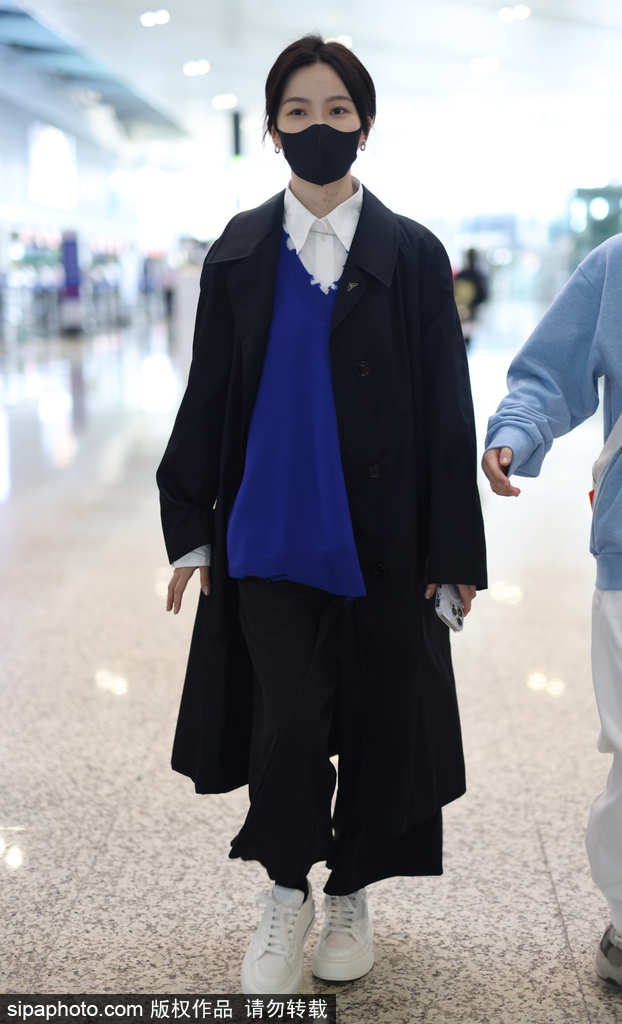 新浪娱乐讯 10月22日,陈卓璇扎着长发口罩遮面 ,身穿白衬衫和蓝色针织马甲搭配黑色宽腿裤手拿外套 ,现身上海机场。(图:SIPA)