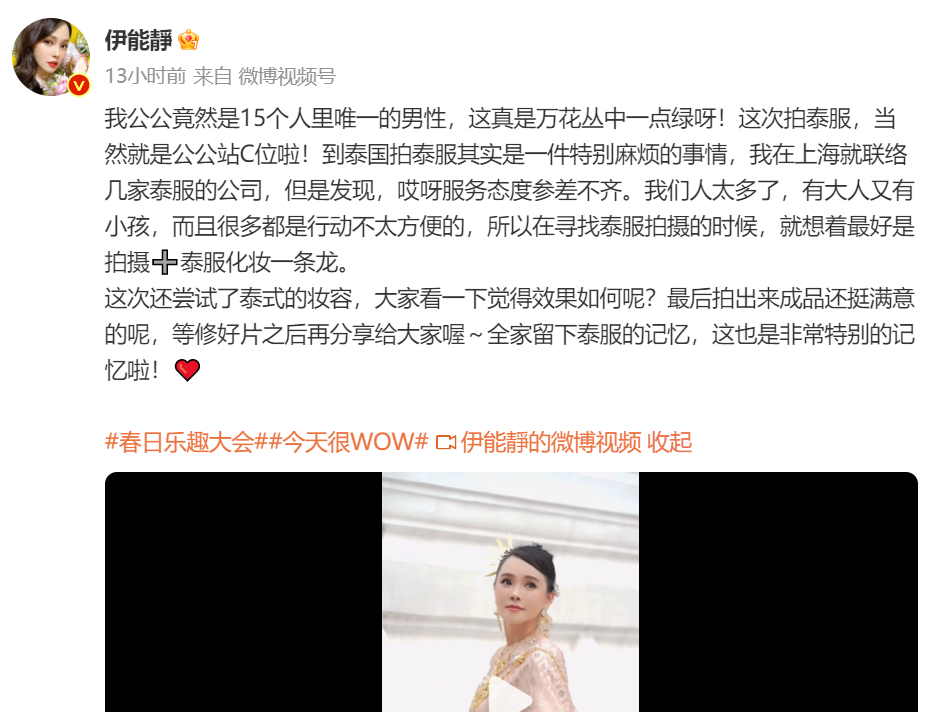 1 / 13新浪娱乐讯 日前,伊能静在微博晒出全家人泰国旅行拍泰服的视频,全家福中,6岁女儿小米粒正脸曝光,长相酷似奶奶。