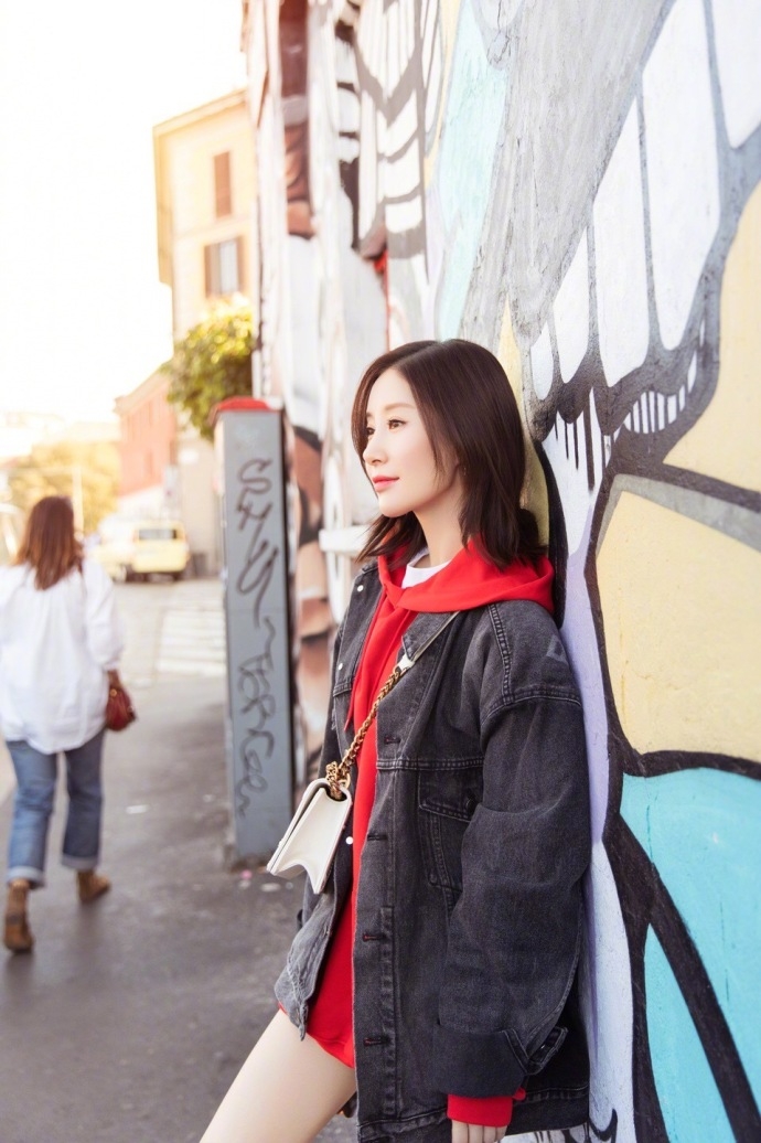 组图:舒畅红色卫衣下衣失踪秀美腿 侧颜精致女人味十足