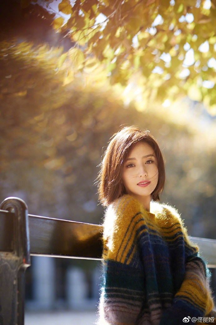组图:佟丽娅穿拼色毛衣闲坐长椅 沐浴阳光展迷人笑眼