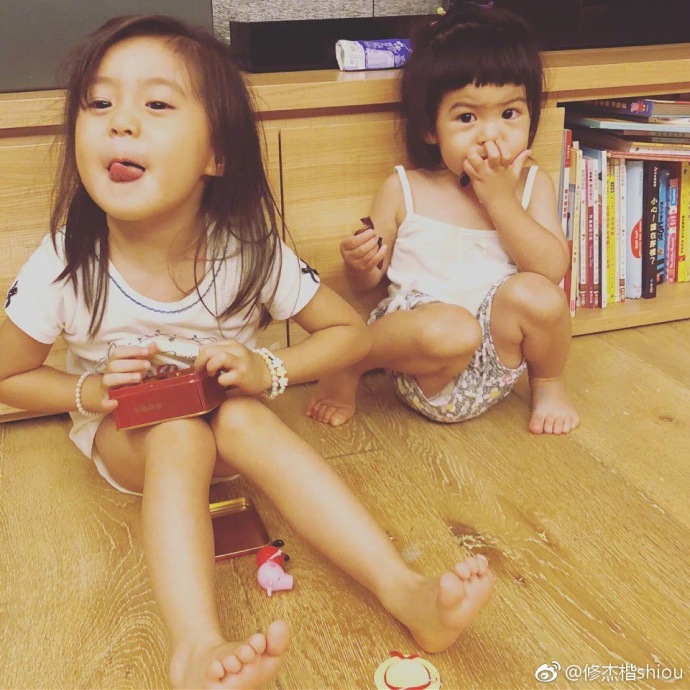 组图:修杰楷晒俩女儿萌照 咘咘比耶吐舌Bo妞刘海很可爱