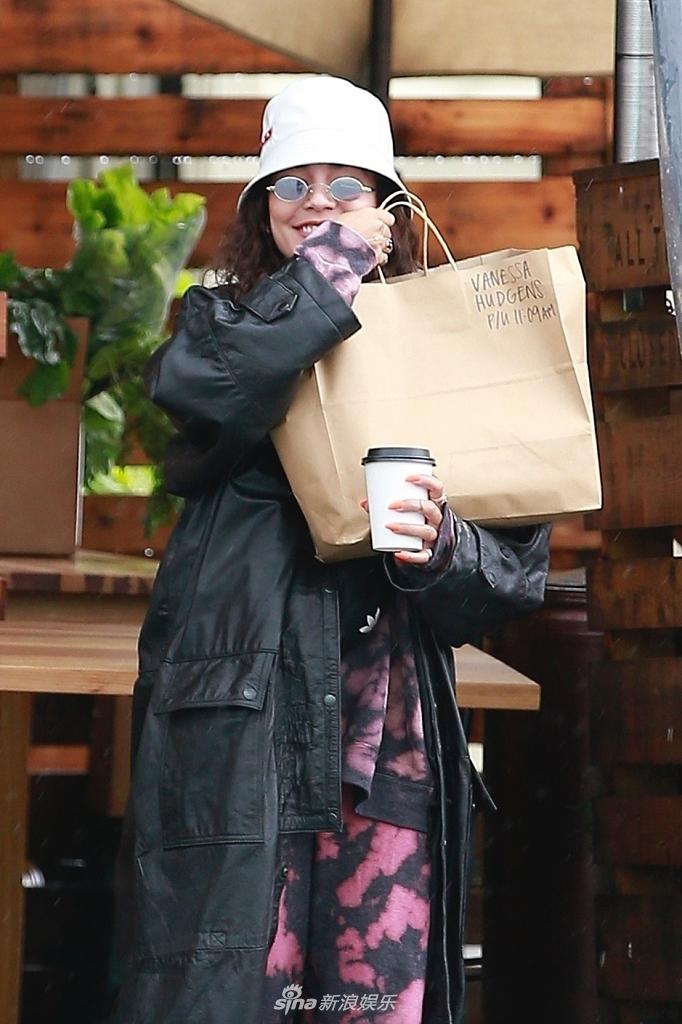 组图:凡妮莎·哈金斯穿皮大衣造型嘻哈 拿热饮对镜灿笑变谐星