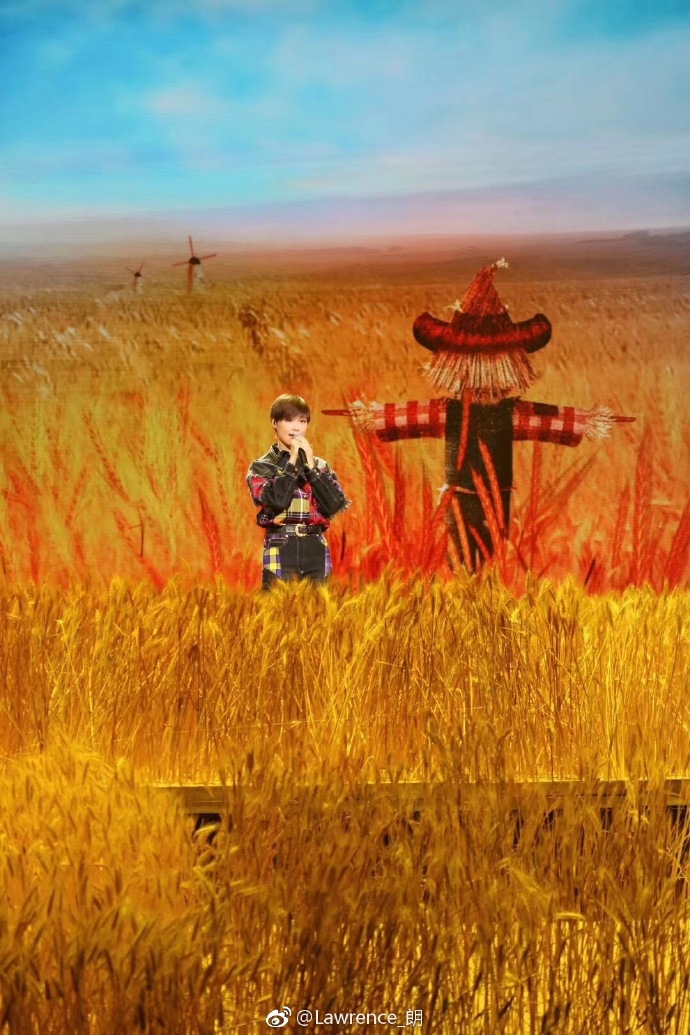新浪娱乐讯 近日,央视国庆晚会录制,有网友在微博曝光一组花絮图,李宇春身穿格子衫,在麦田般的舞台效果中唱歌。凤凰传奇、张国立等人也参与了晚会录制。